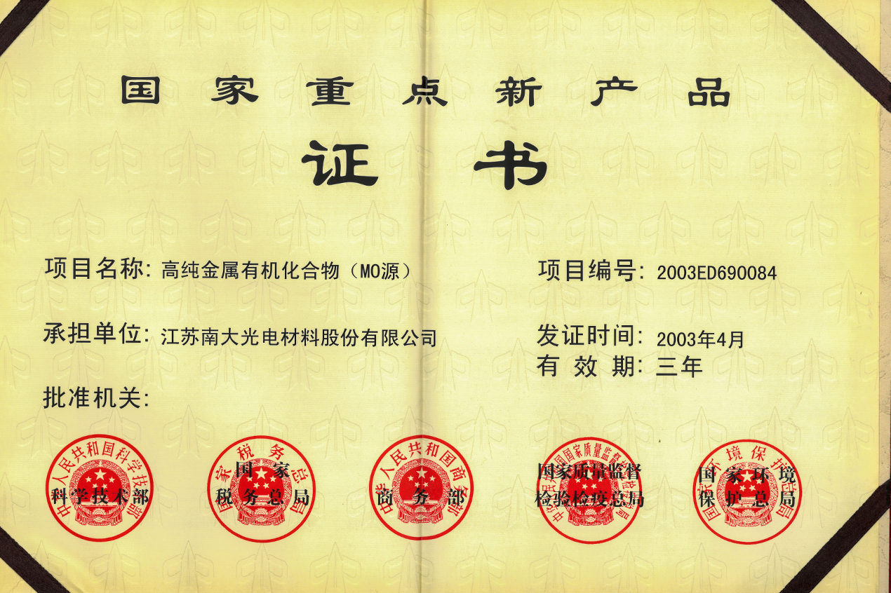 高純金屬有機化合物(MO源)獲得科技部頒發的“國家級火炬計劃項目證書”。